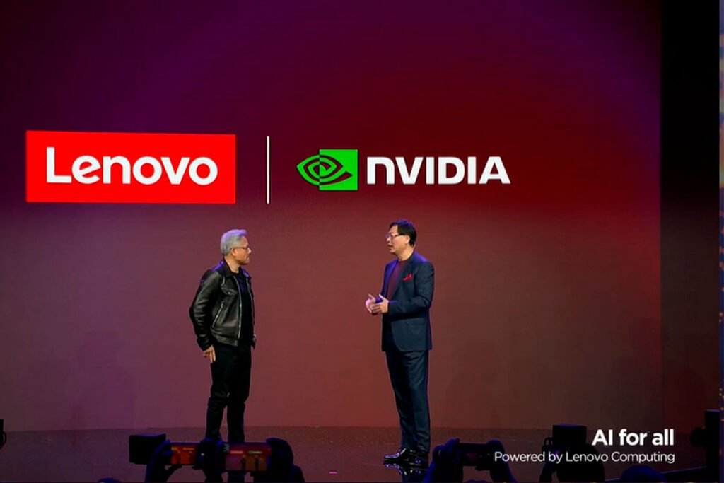 En el escenario, el presidente y CEO de Lenovo, Yuanqing Yang, y CEO y fundador de NVIDIA, Jensen Huang, anunciaron una asociación ampliada con nuevas soluciones híbridas y colaboración de ingeniería para brindar el poder de la IA generativa a todas las empresas.