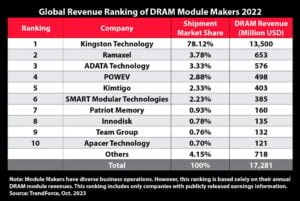 De acuerdo con el informe, los cinco mayores proveedores de módulos de memoria del mundo representaron el 90% de las ventas totales en el 2022, con Kingston manteniendo su participación de mercado dominante del 78.12%. Las tendencias de compra de los consumidores en el área de productos electrónicos se vieron afectadas por la inflación, sin embargo, la fortaleza y confiabilidad de la marca, así como su sólida cadena de distribución mantuvieron a Kingston en la primera posición en la clasificación de participación de mercado. La siguiente tabla muestra a los 10 principales proveedores de módulos DRAM clasificados por TrendForce.