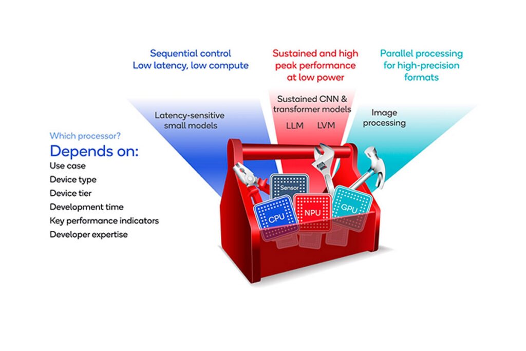 Debido a los diversos requisitos y demandas computacionales de la IA generativa, se necesitan diferentes procesadores. Una arquitectura informática heterogénea con diversidad de procesamiento brinda la oportunidad de utilizar los puntos fuertes de cada procesador, es decir, una NPU diseñada a medida centrada en la Inteligencia Artificial, junto con la CPU y la GPU, cada una de las cuales sobresale en diferentes dominios de tareas. Por ejemplo, la CPU para control secuencial e inmediatez, la GPU para transmisión de datos paralelos y la NPU para cargas de trabajo centrales de Inteligencia Artificial con matemáticas escalares, vectoriales y tensoriales.