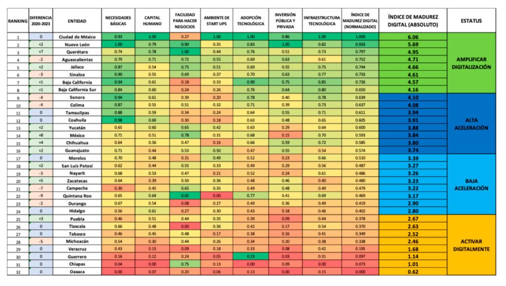 Tras evaluar esas siete áreas, se determinó la puntuación final de cada estado a partir de las cuarenta y una métricas que las componen, mediante fórmulas de normalización y ponderación. Posteriormente, los estados se colocaron en uno de los cuatro estadios de preparación: Activar Digitalmente, Baja Aceleración, Alta Aceleración y Amplificar Digitalización.